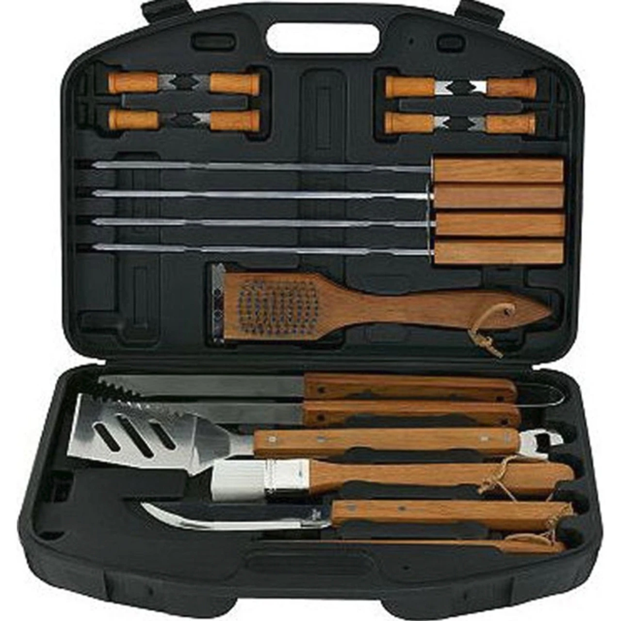Cook outdoors with barbeque tools from Mr. Bar-B-Q. This 18-Piece BBQ Tool Kit is a complete set that has all the tools that you would need to grill like a pro. This stainless-steel grill tool set comes with a spatula, basting brush, carving fork, grill brush, and carving knife. The set also includes tongs, 4-skewers, as well as eight corn holders. The handles are also long enough to allow you to cook without burning yourself. Made from stainless steel, the items in this grilling tool set are strong and durable. You can efficiently sort and organize all the tools in this set using the provided carry case.